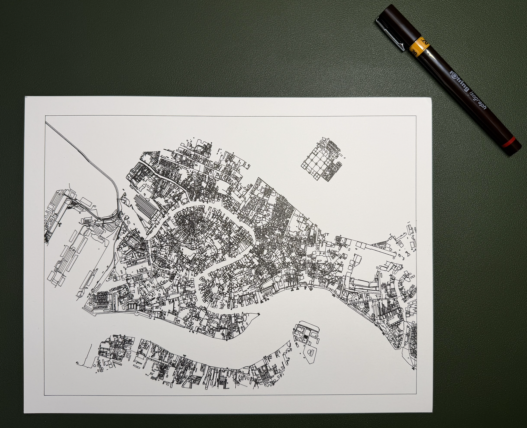 Every Penmaps print is created using a precision pen plotter—a robotic drawing machine that guides a real pen across premium paper, drawing each line of your map one stroke at a time. This process can take several hours for complex maps, resulting in a truly unique piece of art.